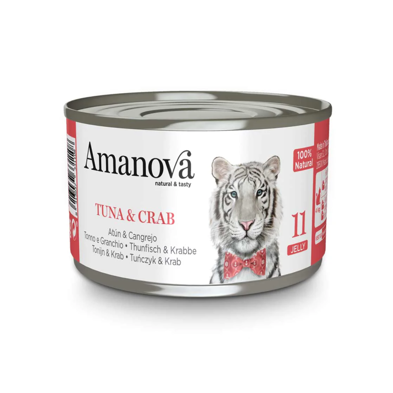 Amanova Lata Gato Tuna & Crab Jelly es un alimento húmedo premium y natural para gatos, elaborado con atún fresco (55%) y trozos de cangrejo (6%), ofreciendo una textura suave en gelatina ligera que resulta irresistible para los felinos. Su receta sencilla y nutritiva está diseñada para complementar la dieta de tu gato con proteínas de alta calidad, bajas en grasa y fácilmente digestibles.