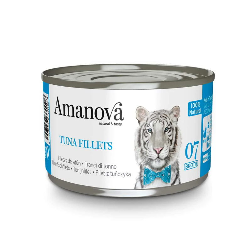 Amanova Lata Gato Tuna Fillets Broth es un alimento húmedo premium y natural para gatos, elaborado con atún fresco de alta calidad (65%) y un toque de arroz (1%), en un delicioso caldo ligero y nutritivo. Esta receta sencilla proporciona proteínas de calidad, bajas en grasa y fáciles de digerir, ideales para gatos de todas las edades.