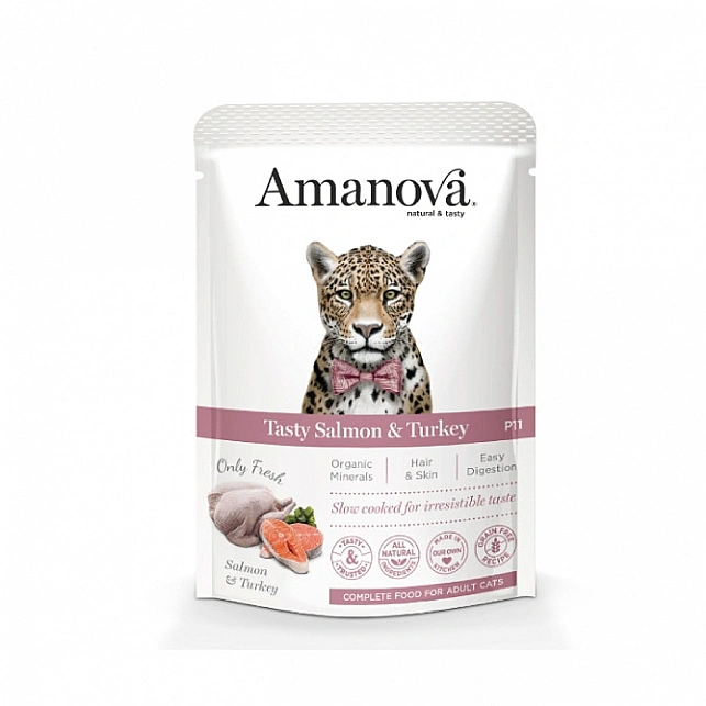 Amanova Pouch P11 Cat Salmon & Turkey es una comida húmeda premium para gatos, nutricionalmente completa, sin cereales, elaborada con salmón y pavo frescos de alta calidad. Su receta exclusiva, cocinada a fuego lento, combina sabores irresistibles con ingredientes naturales como algas marinas ricas en minerales, que aportan nutrientes esenciales para el bienestar general de tu felino.