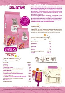 Arion Friends Cat Sensitive es un alimento completo para mantenimiento de gatos con apetito caprichoso y sensibilidad digestiva. Su composición, con carne de pavo de alta calidad y salmón como únicas fuentes de proteína animal, lo convierten en un producto único para gatos sensibles. Incorpora también aceite de salmón, ingrediente que le aporta una dosis extra de omega3, lo cual lo convierte en un producto ideal para el cuidado de la piel y el pelo. También contiene un elevado aporte de taurina, aminoácido esencial en el metabolismo felino.