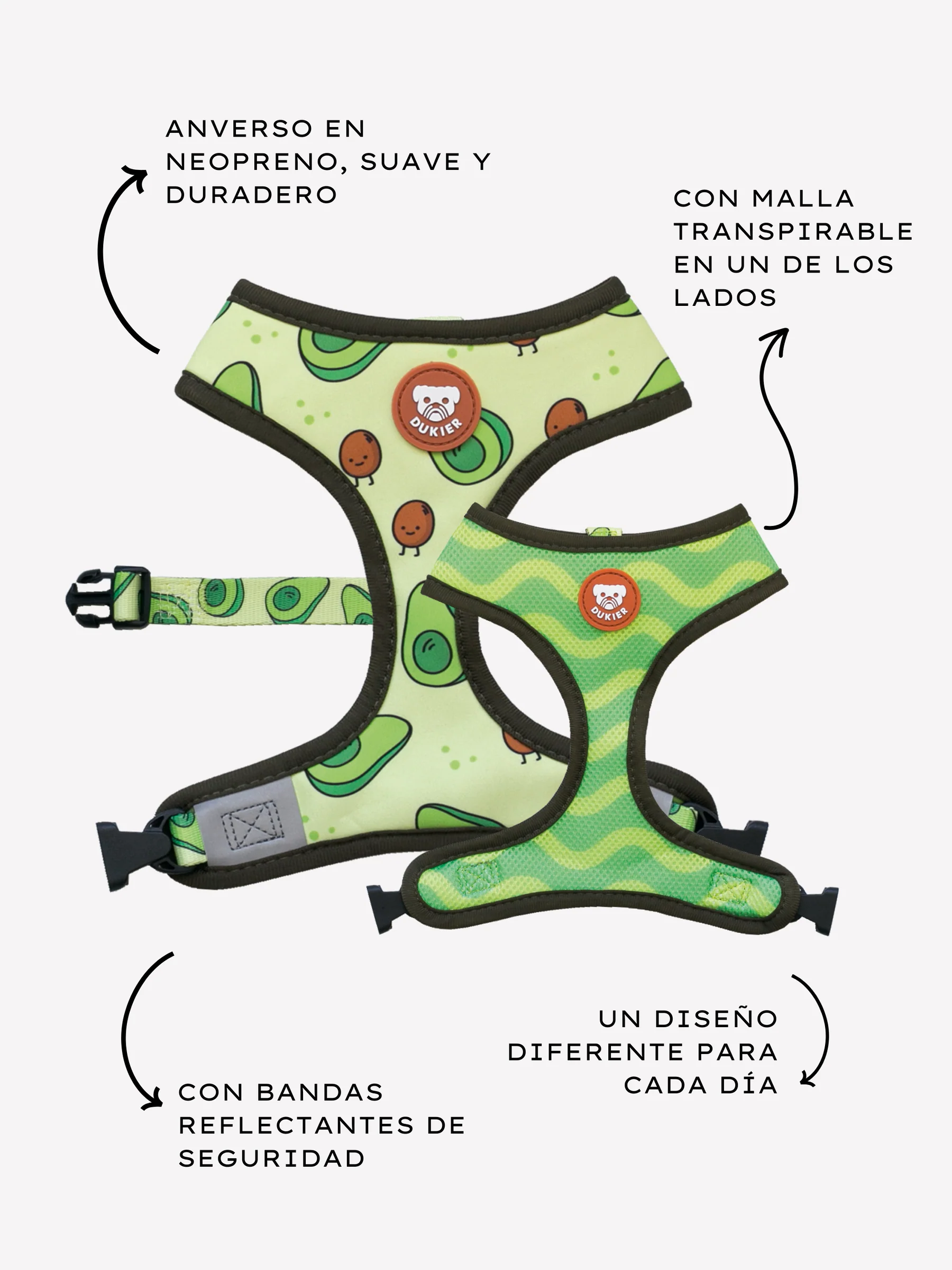Este arnés es súper cómodo y ajustable al pecho de tu perro, además es reversible, con un diseño chuli a cada lado, para que nunca os aburráis de él. Tejido neopreno por un lado y malla transpirable por el otro para que tu perro se sienta la mar de a gusto.