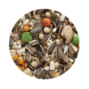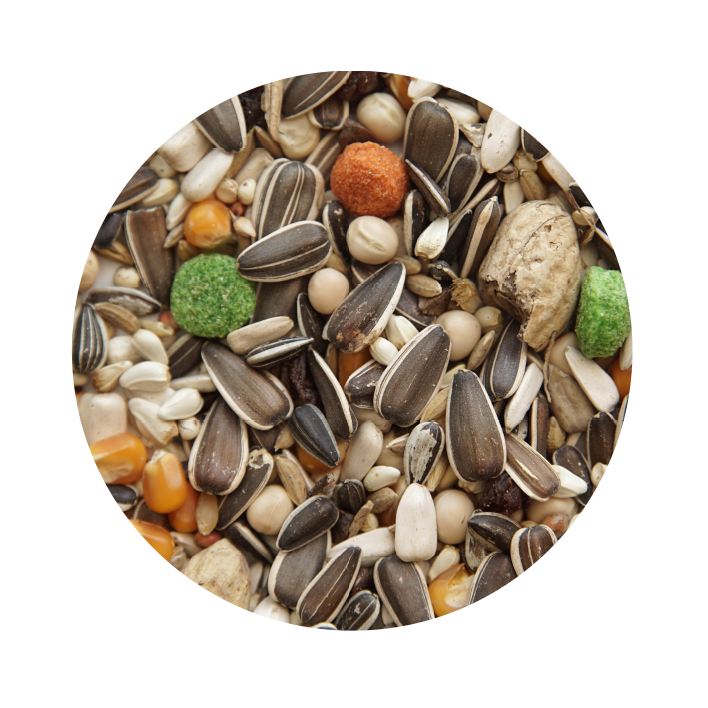 Esta fórmula incluye girasol, cártamo, guisantes, sorgo, trigo, dary, sultanas, maíz, arroz con cáscara, cebada, avena pelada, alforfón, maní con cáscara, pepitas y galletas multicolores, ofreciendo una alimentación variada y equilibrada que satisface las necesidades energéticas y nutricionales de los papagayos.