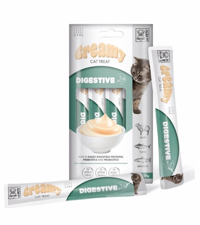 Creamy Cat Digestive Cordero, Atún & Salmón (15 g x 4) es un snack cremoso especialmente formulado para favorecer una digestión equilibrada y saludable en gatos de todas las edades.