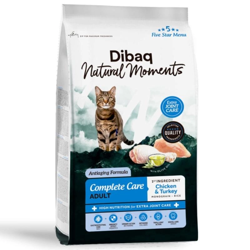 Dibaq Natural Moments Complete Care Pollo y Pavo es un alimento completo y equilibrado para gatos adultos, formulado con ingredientes de alta calidad que favorecen la salud general y el bienestar felino. Contiene pollo deshidratado e hidrolizado (24 %) y pavo deshidratado (21 %) como principales fuentes de proteínas de fácil digestión, combinadas con arroz, guisantes y patata, proporcionando energía fácilmente asimilable para gatos activos.