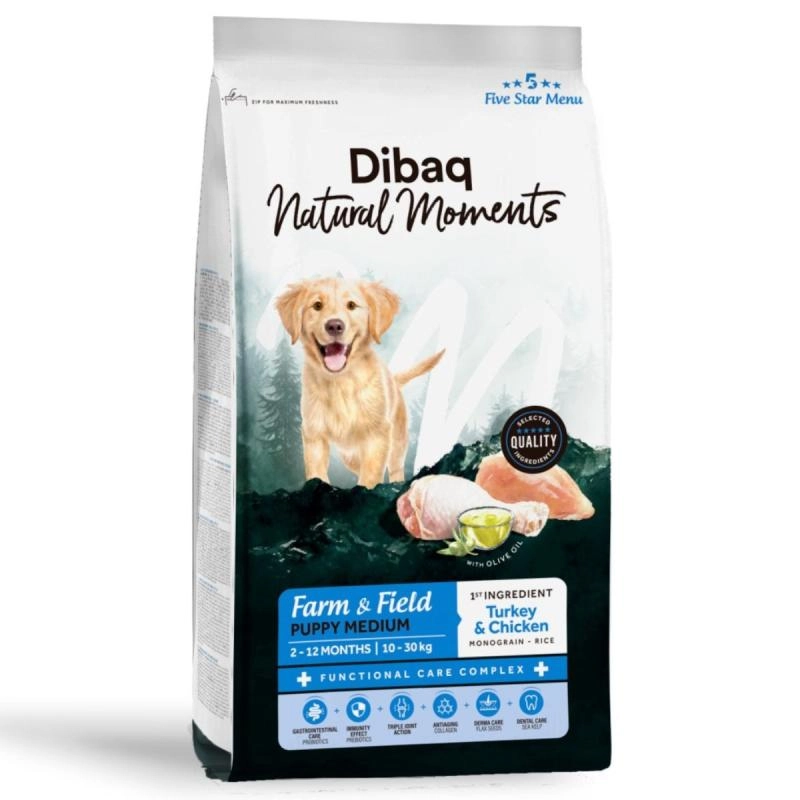 Dibaq Natural Moments Puppy Medium Farm & Field Pollo y Pavo es un pienso completo y natural para cachorros de tamaño mediano, formulado para favorecer un crecimiento equilibrado, el correcto desarrollo muscular y unas articulaciones fuertes y saludables durante la etapa de crecimiento.