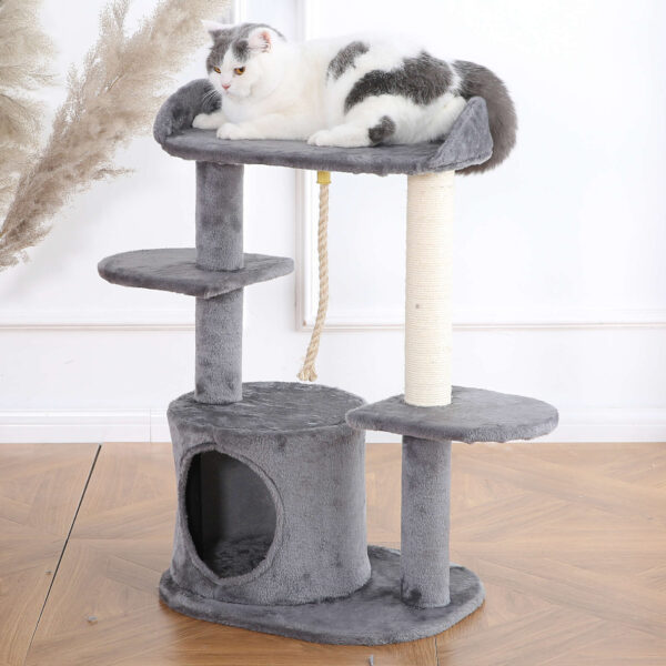 Este rascador mantiene las garras de tu gato en forma y tus muebles seguros con sus múltiples postes para rascar, su gran poste de sisal es ideal para satisfacer sus necesidades. Incluye una cuerda colgante que añade un extra de diversión y juego.