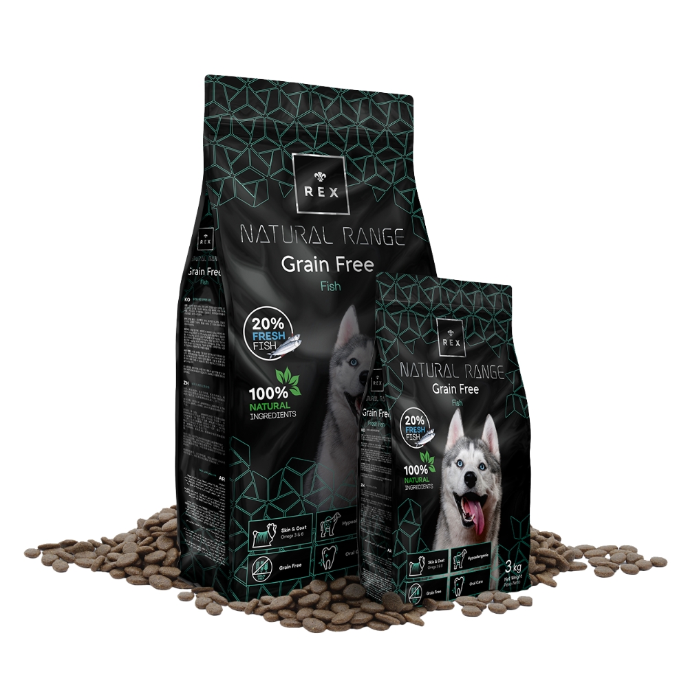 Rex Natural Range Grain Free Fish es un alimento sin cereales para perros adultos, ideal para intolerancias o alergias al gluten, con proteína de pescado de alta calidad, prebióticos, Omega 3 y 6 para digestión, piel y pelaje saludables.