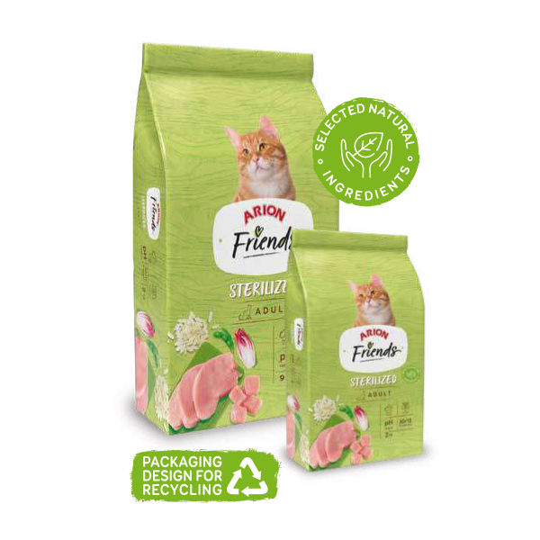 Arion Friends Cat Sterilized es un alimento completo para gatos esterilizados o gatos con tendencia al sobrepeso. Su composición, con carne de pavo de alta calidad como única fuente de proteína animal, asegura un óptimo mantenimiento del peso ideal con un producto muy nutritivo y apetitoso. Sus bajos niveles de calorías y la incorporación de L-carnitina favorecen la pérdida de peso y su mantenimiento posterior en los gatos esterilizados. Incorpora también aceite de salmón en su composición, ingrediente que le aporta una dosis extra de omega3, lo cual lo convierte en un producto ideal para el cuidado de la piel y el pelo. También contiene un elevado aporte de taurina, aminoácido esencial en el metabolismo felino.