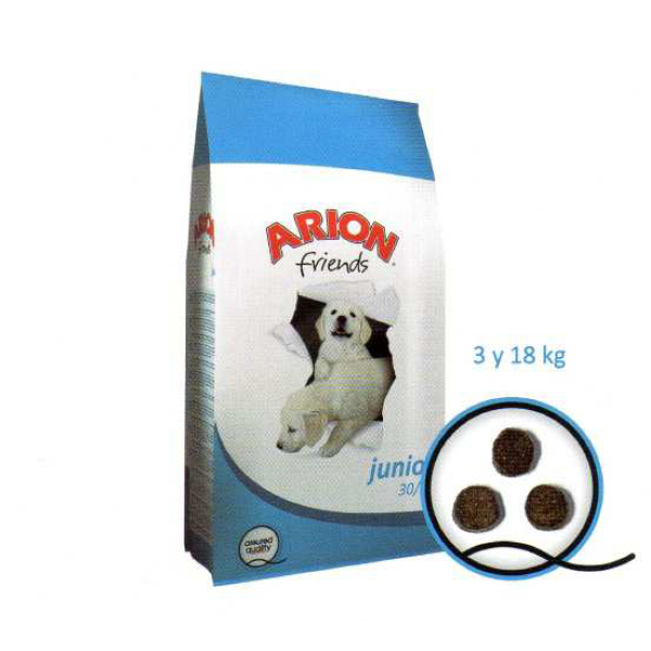 Arion Friends Junior es un alimento completo para cachorros. Está diseñado para conseguir un desarrollo armónico de los cachorros hasta los 12 o 18 meses de vida, dependiendo del tamaño adulto de la raza. Las razas grandes y gigantes finalizan su desarrollo más tarde y por ello tienen que continuar consumiendo este producto hasta que completen su crecimiento definitivo. Incorpora altos niveles de proteínas de calidad como la carne de pollo, la hemoglobina y el pescado para favorecer un vigoroso crecimiento del cachorro. La incorporación de condroprotectores y L-carnitina asegura un crecimiento acompasado y la protección de las articulaciones.
