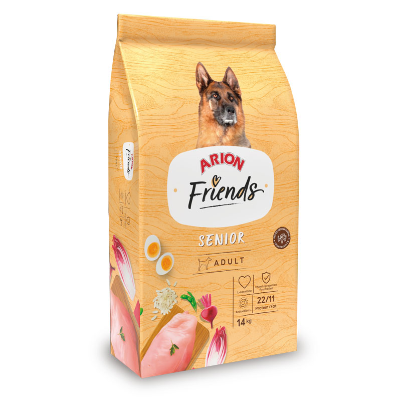Arion Friends Senior es un alimento completo para perros de razas grandes de más de 7 años y perros de razas pequeñas que superan los 9 años. Su fórmula antienvejecimiento contiene altas dosis de vitamina E como antioxidante, una baja concentración de fósforo para prevenir el deterioro renal y condroprotectores para proteger las articulaciones. Contiene proteínas de alta calidad y muy nutritivas como la carne de pollo y el huevo deshidratado.