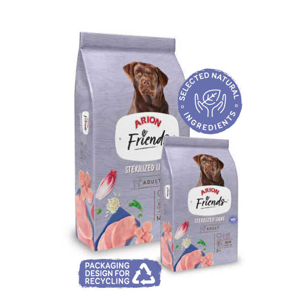 Arion Friends Sterilized Light es un alimento completo para perros esterilizados o con tendencia al sobrepeso. Su fórmula baja en grasas y con proteínas de alta calidad favorece el control efectivo del sobrepeso y un estado corporal óptimo. La incorporación de condroprotectores protege sus articulaciones y la L-carnitina favorece el tono muscular contribuyendo a quemar mejor la grasa subcutánea. Incorpora altos niveles de fibras vegetales para incrementar la sensación de saciedad y plenitud gástrica y disminuir la ingesta en perros de apetito incontrolado.