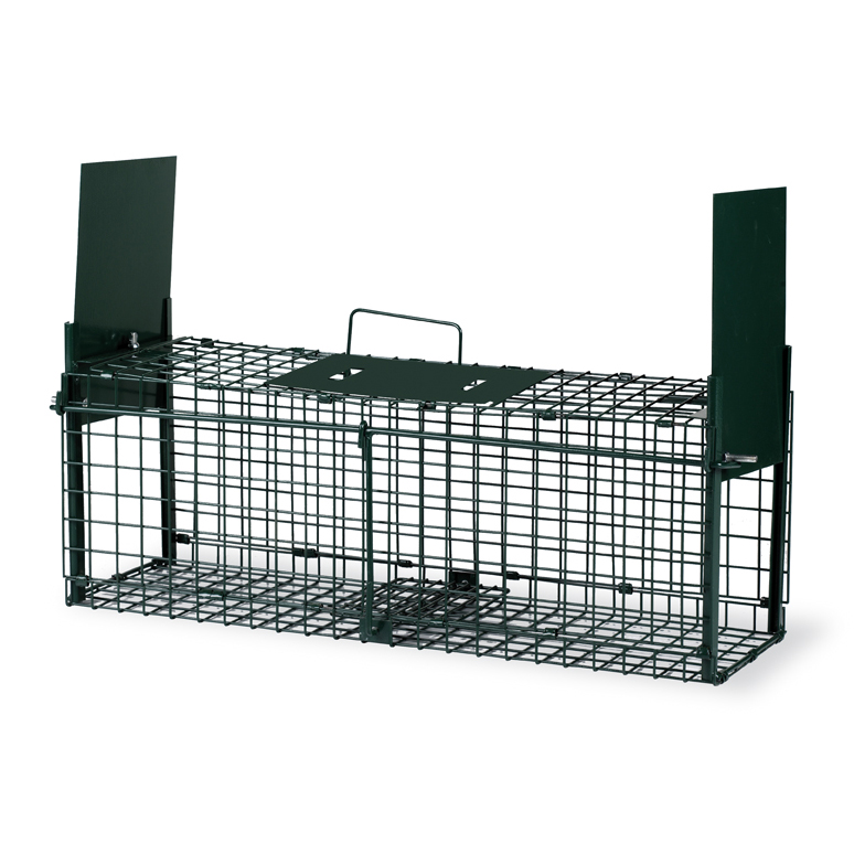 Jaula-Trampa confeccionada con 2 puertas y malla de alambre de zinc, y diseñada para cazar animales. Fabricada con 2 puertas. Gracias a que se puede plegar, se facilita el transporte o el almacenamiento.