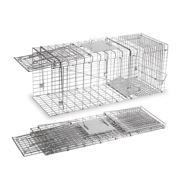 Jaula-Trampa confeccionada con 2 puertas y malla de alambre de zinc, y diseñada para cazar animales. Fabricada con 2 puertas. Gracias a que se puede plegar, se facilita el transporte o el almacenamiento.